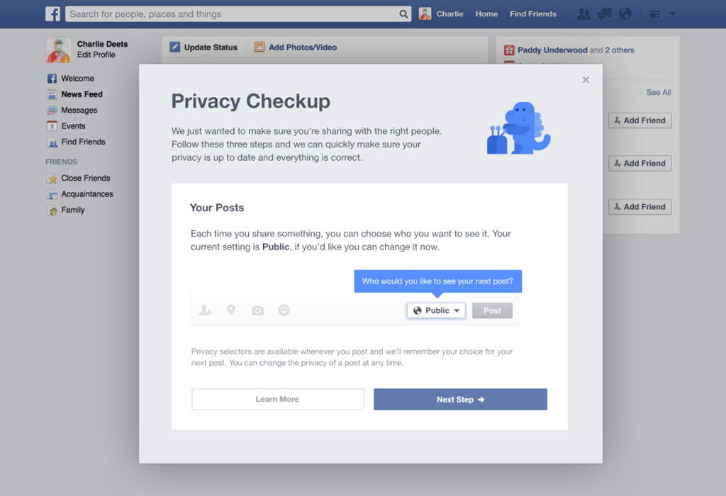 Numa sociedade em que nos sentimos invadidos em diversos campos, nomeadamente no âmbito Digital e, em que o valor que damos à privacidade é elevado, o ressuscitar de um "Dinossauro" contribuirá para percepcionarmos um sinal de protecção, aumentando o grau de confiança relativamente à utilização da rede social Facebook. Segundo este trata-se de uma “ferramenta nova e alargada para rever a privacidade”, de forma a evitar que mensagens sejam partilhadas, quando o objetivo não era esse.