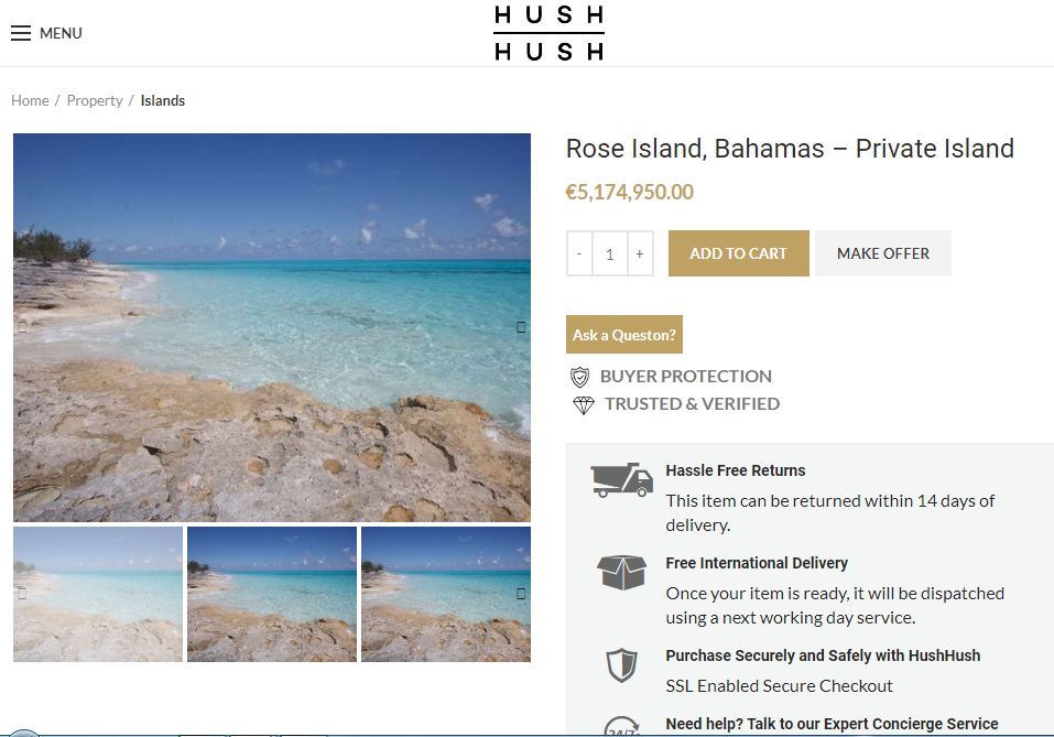 É mesmo isso, uma ilha! No website hushhush.com, a Amazon dos milionários, é possível escolher entre mais de 200.000 artigos de luxo divididos pelas 12 categorias de que o site dispõe.